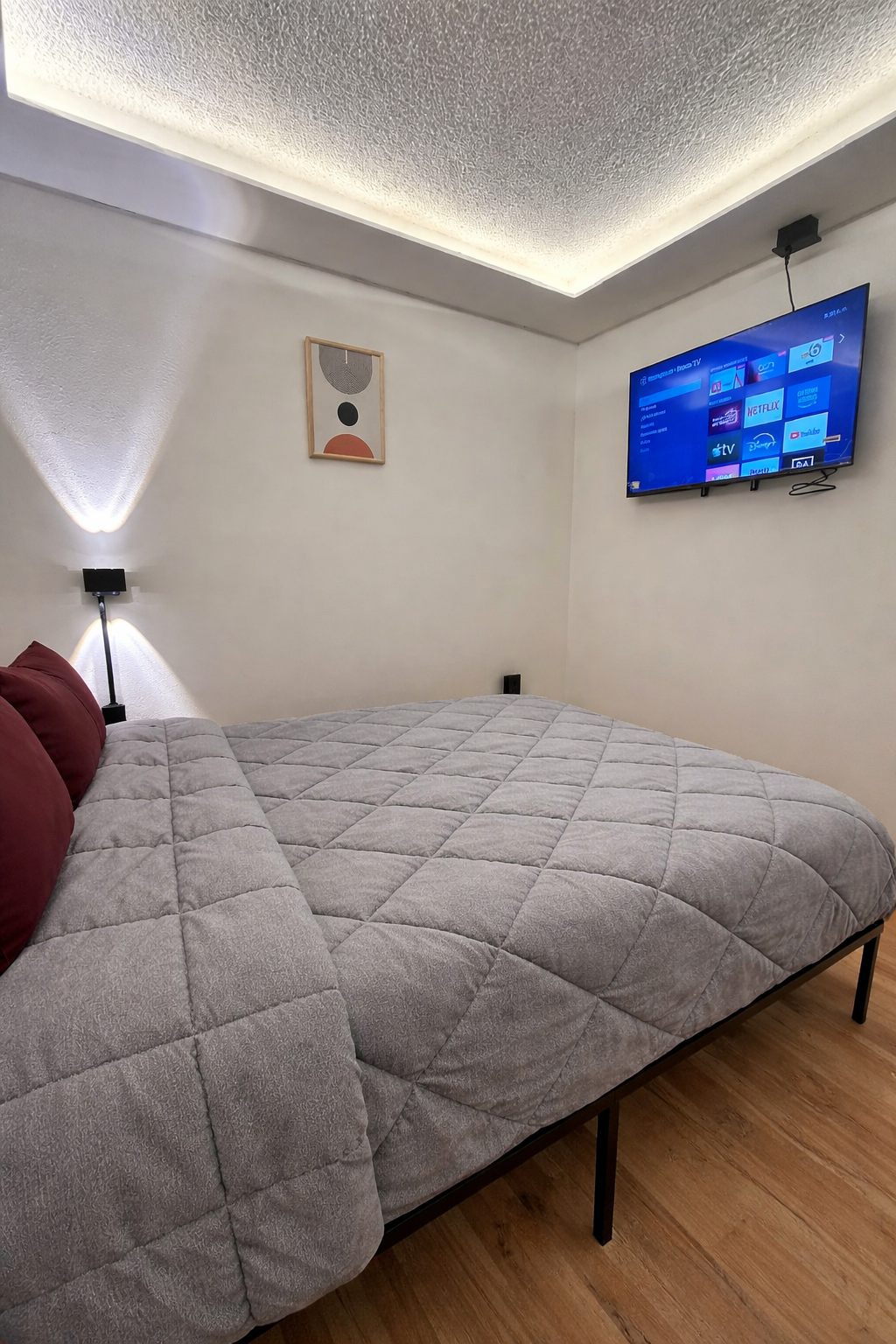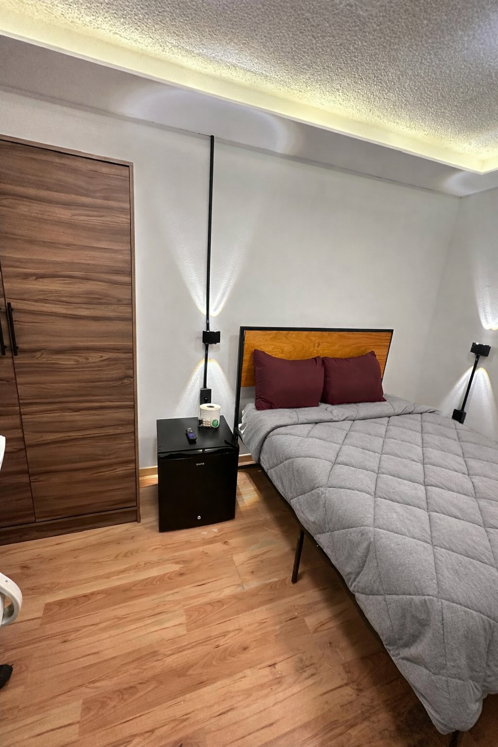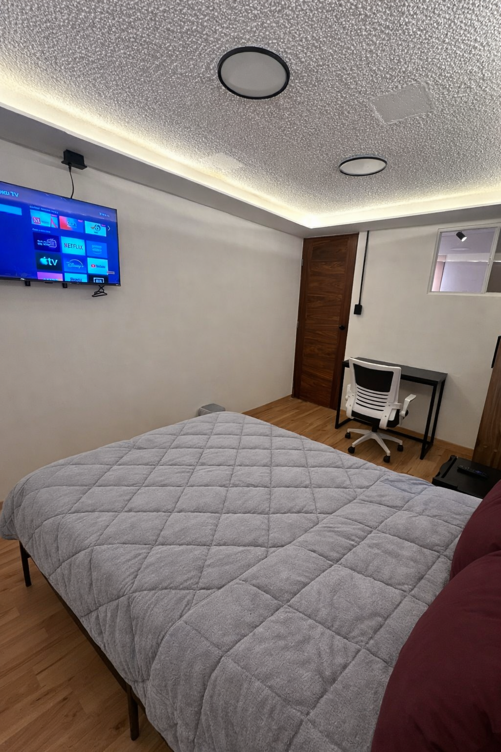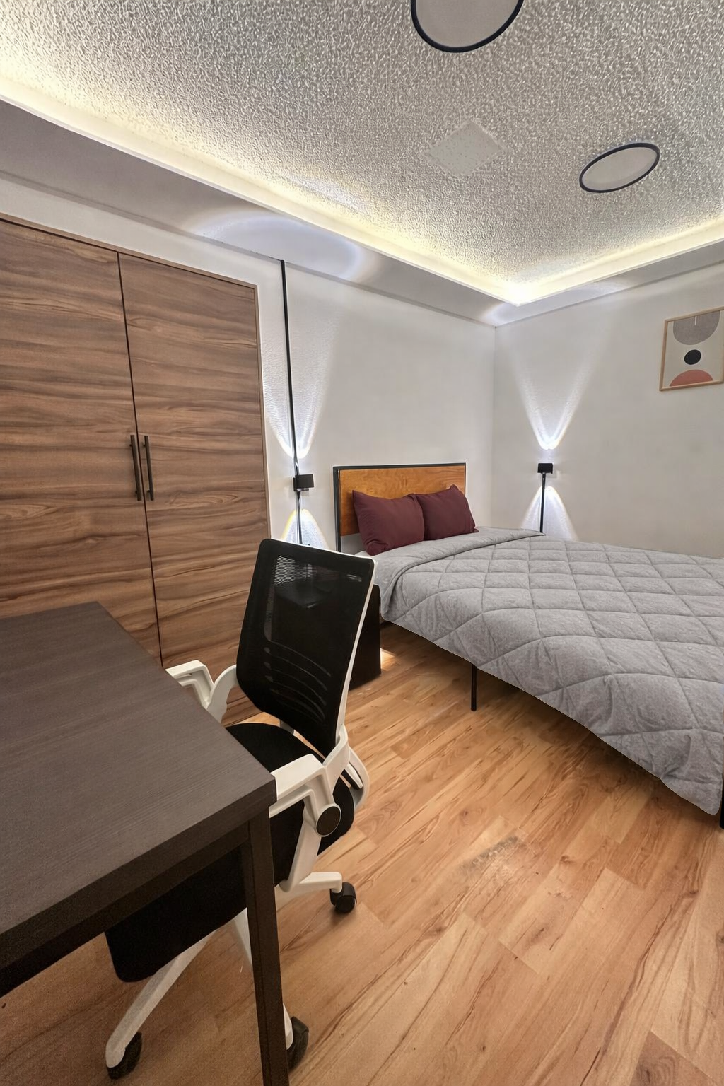 Habitación privada en zona céntrica y en calle con vigilancia 24/7, ideal para quien busca seguridad y comodidad. Cuenta con cama con colchón memory foam para un descanso profundo, escritorio con silla de trabajo, Smart TV y frigobar propio. Incluye clóset amplio, internet de alta velocidad y acceso a baño con diseño moderno y excelentes acabados, además de lavadora. Un espacio funcional, cómodo y bien ubicado para estancias prácticas y agradables.